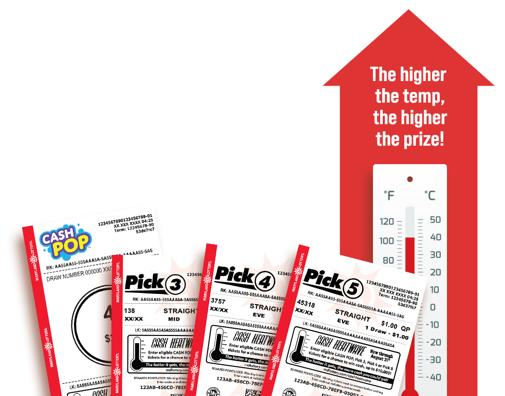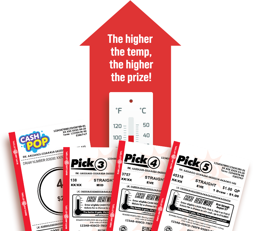 *The highest recorded temperature at Baltimore/Washington International Thurgood Marshall Airport (BWI) by the National Weather Service (“NWS”), as updated at www.weather.gov, during the corresponding Temperature Review Dates. The highest temperature recorded used for this Promotion is from the National Weather Service; however, the National Weather Service does not endorse this Promotion or the Maryland Lottery and is not affiliated with the Maryland Lottery in any way. See Official Rules for full Promotion details.